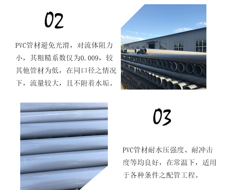 PVC管的壁面光滑,對流體的阻力小,其粗糙系數(shù)僅為0.009,較其他管材為低,在相同的流量下,管徑可予縮小。