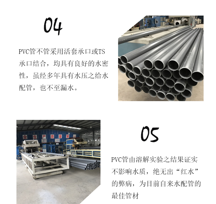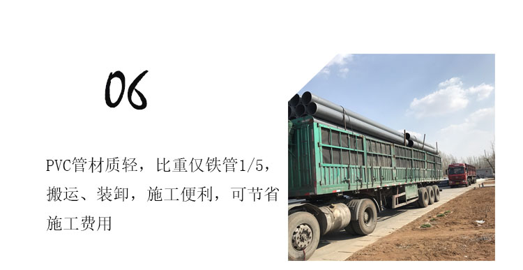 PVC管材材質(zhì)很輕,搬運(yùn),施工便利,可節(jié)省人工。